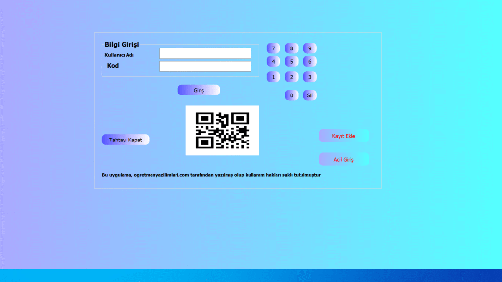 - “Acil giriş” butonu ise Qrkod okutmadan tahtayı hızlıca açmak isteyen yetkili için klavye ile hemen programı açmak için kullanılır. Acil giriş yapabilmek için yine “admin şifresi” gereklidir.